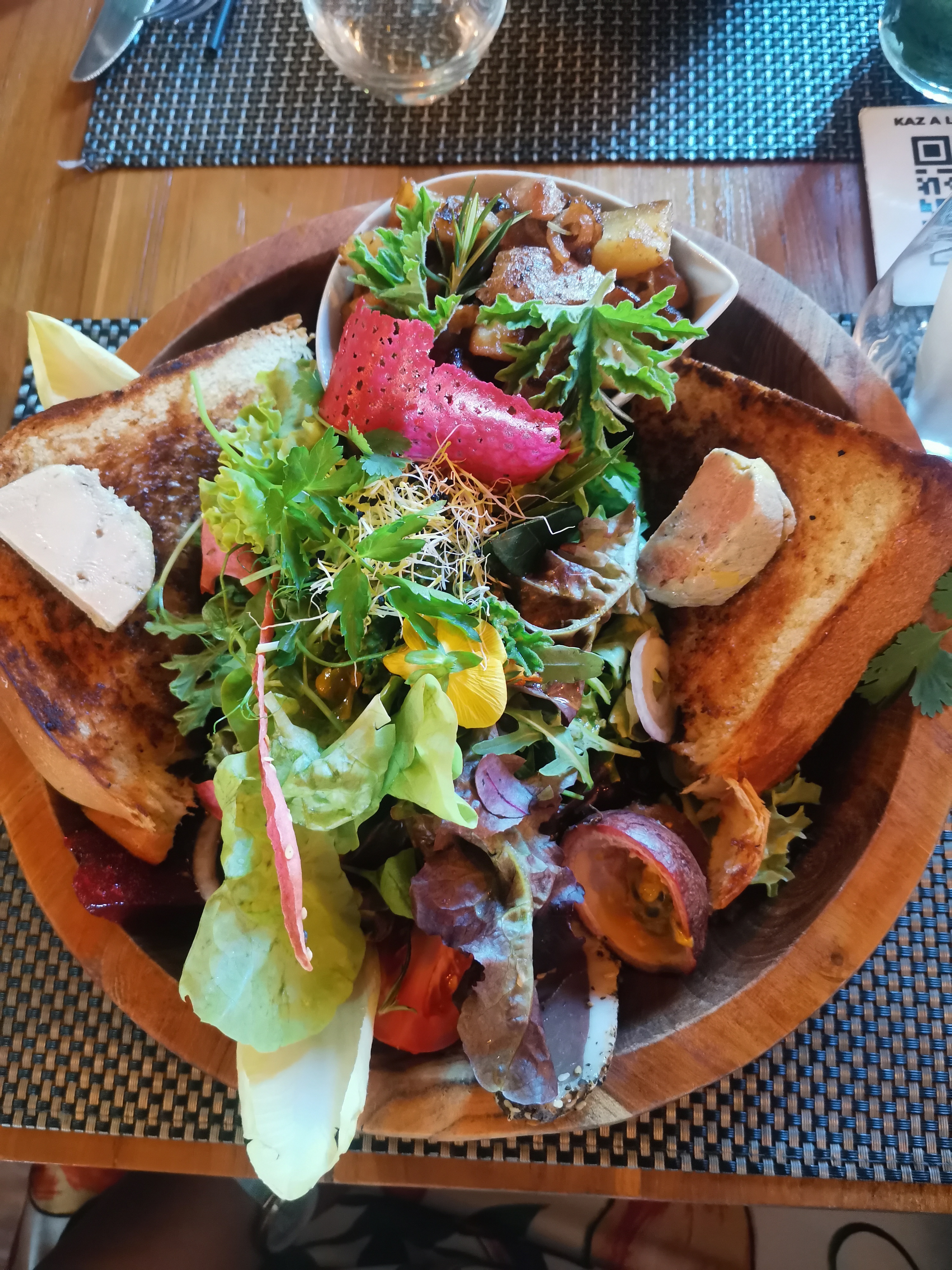 Bonsoir, Merci d’avoir pris le temps de partager votre expérience. Nous sommes navrés que la salade n’ait pas été à la hauteur de vos attentes, or sur le menu vous avez bien tous les ingrédients qui seront dans la salade : pourquoi l’avoir pris si vous saviez que vous n’alliez pas aimer le côté terre et mer ? Dans la salade se trouvent du magret de canard séché maison, des gambas, ainsi que du tartare de thon, donc vous avez des produits frais et faits maison d’où le prix de la salade. Nous vous souhaitons une belle soirée, et espérons pouvoir vous accueillir de nouveau afin de vous offrir une meilleure expérience. La Kaz à Léa